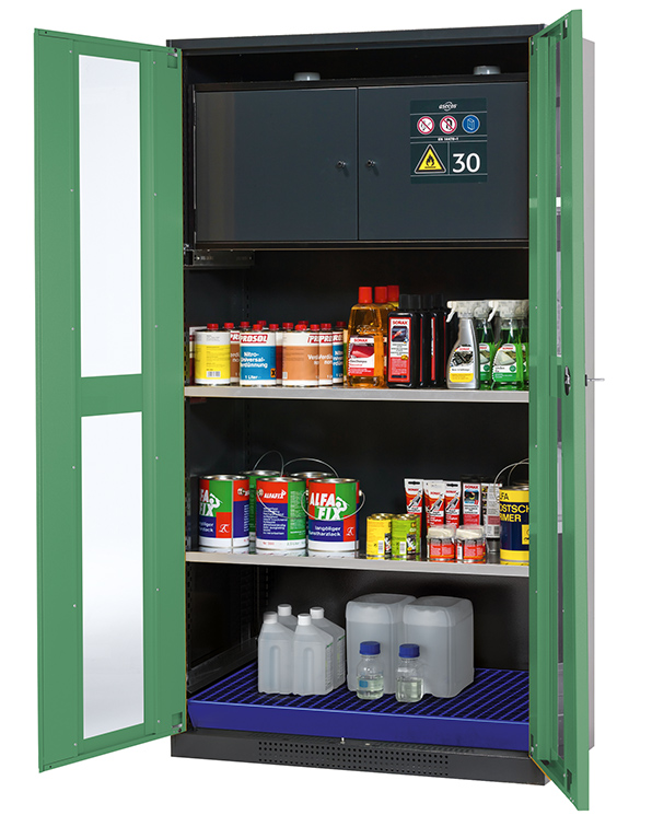 - Säkerhetslåda typ 30: för korrekt förvaring av brandfarliga farliga material i arbetsrum, enligt EN 14470-1 (typ 30) och TRGS 510, 2 självstängande gångjärnsdörrar, nedre uppsamlingsbrunn, pulverlackerat stål med 8,5 liters volym och anslutning till frånluft (DN) 75) för teknisk ventilation av säkerhetslådan