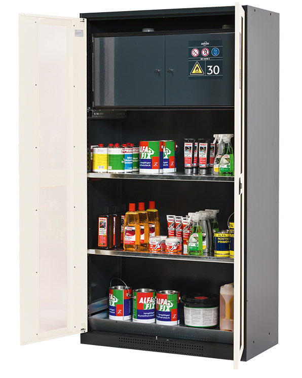 - Säkerhetslåda typ 30: för korrekt förvaring av brandfarliga farliga material i arbetsrum, enligt EN 14470-1 (typ 30) och TRGS 510, 2 självstängande gångjärnsdörrar, nedre uppsamlingsbrunn, pulverlackerat stål med 8,5 liters volym och anslutning till frånluft (DN) 75) för teknisk ventilation av säkerhetslådan