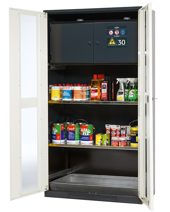 - Säkerhetslåda typ 30: för korrekt förvaring av brandfarliga farliga material i arbetsrum, enligt EN 14470-1 (typ 30) och TRGS 510, 2 självstängande gångjärnsdörrar, nedre uppsamlingsbrunn, pulverlackerat stål med 8,5 liters volym och anslutning till frånluft (DN) 75) för teknisk ventilation av säkerhetslådan