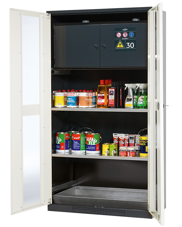 - Säkerhetslåda typ 30: för korrekt förvaring av brandfarliga farliga material i arbetsrum, enligt EN 14470-1 (typ 30) och TRGS 510, 2 självstängande gångjärnsdörrar, nedre uppsamlingsbrunn, pulverlackerat stål med 8,5 liters volym och anslutning till frånluft (DN) 75) för teknisk ventilation av säkerhetslådan